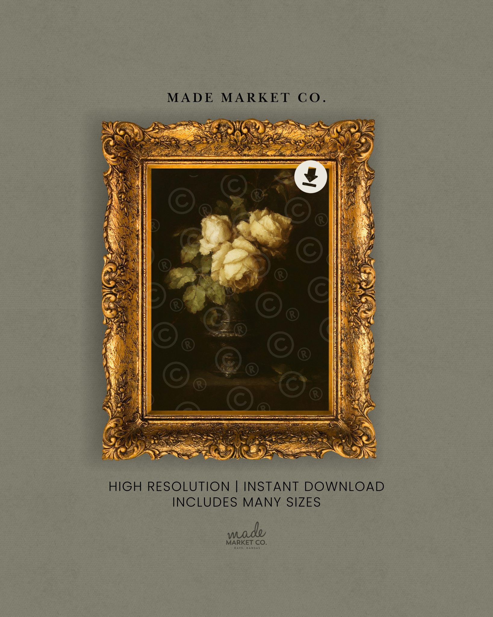 Your purchase includes five printable sizes—3×3, 5×5, 4×6, 5×7, and 8×10—so you can trim and frame it however you like. Whether you’re styling a small nook or layering into a curated display, this vintage floral rose print brings elegance, texture, and story to any space.