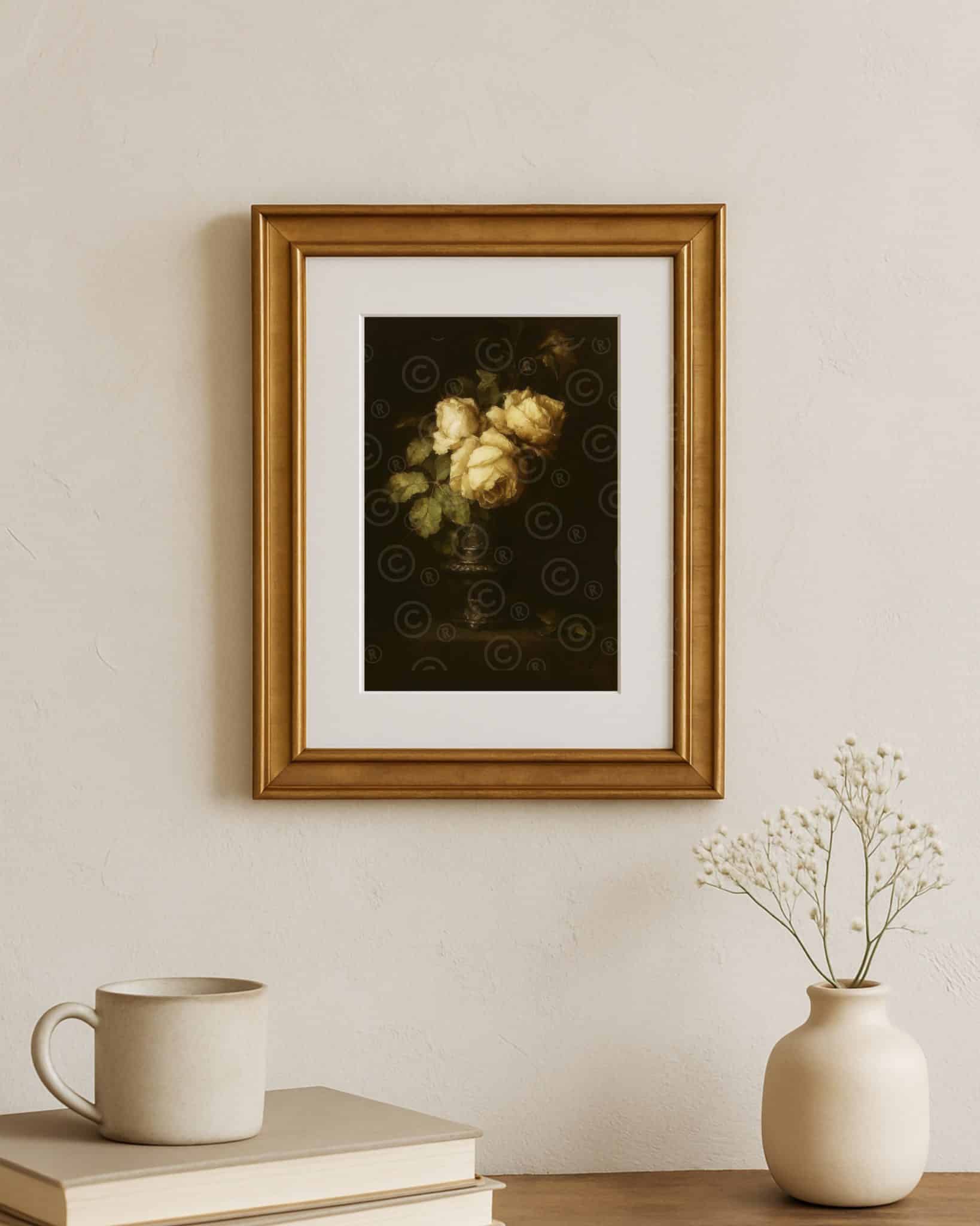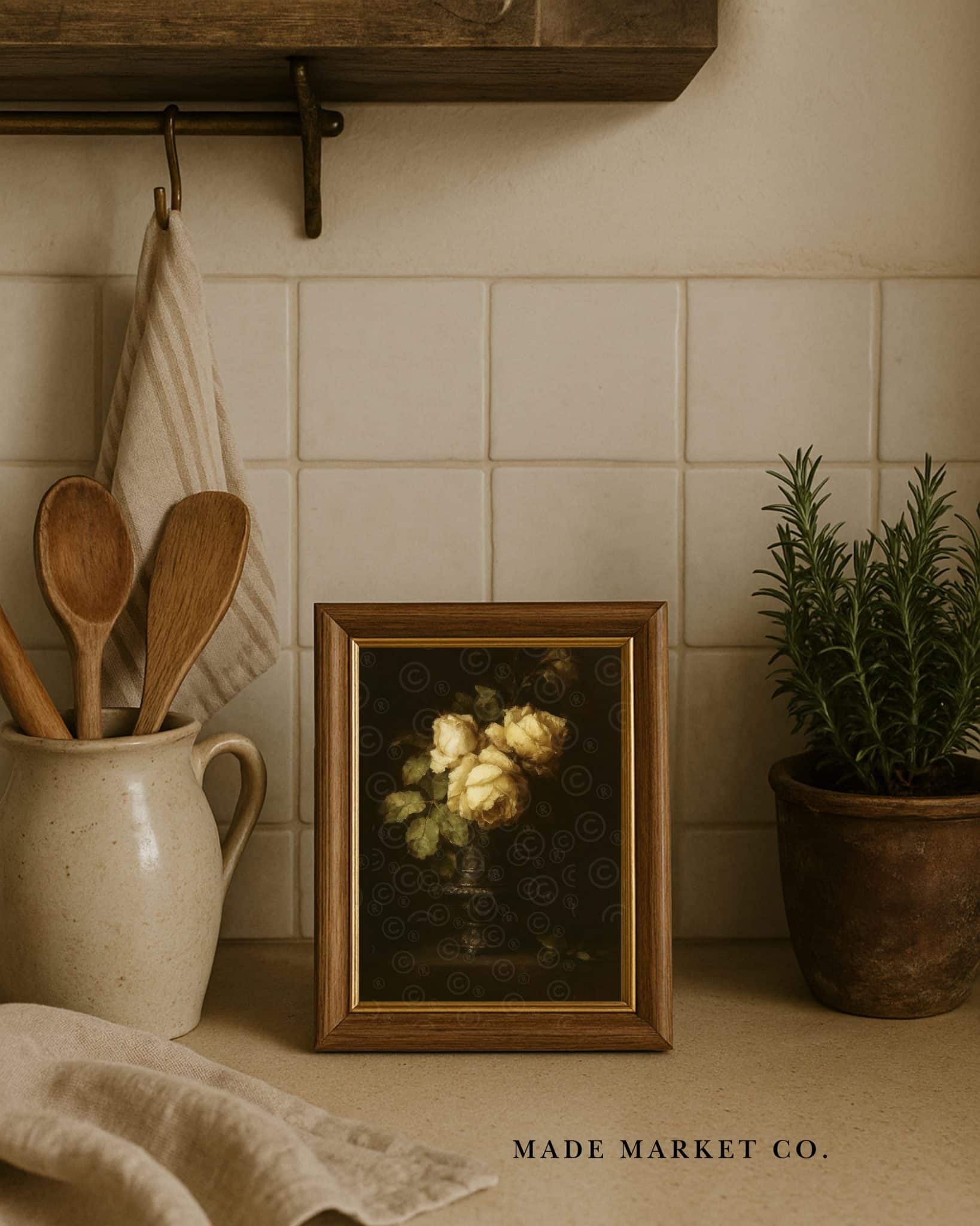 Add a soft, vintage-inspired touch to your decor with our Digital Art Print Moody Vintage Floral Rose. This downloadable artwork features a still-life vase of roses, rendered in painterly, timeworn style. Designed in-house, this instant digital download is perfect for adding nostalgic charm to shelves, gallery walls, or tabletop frames.